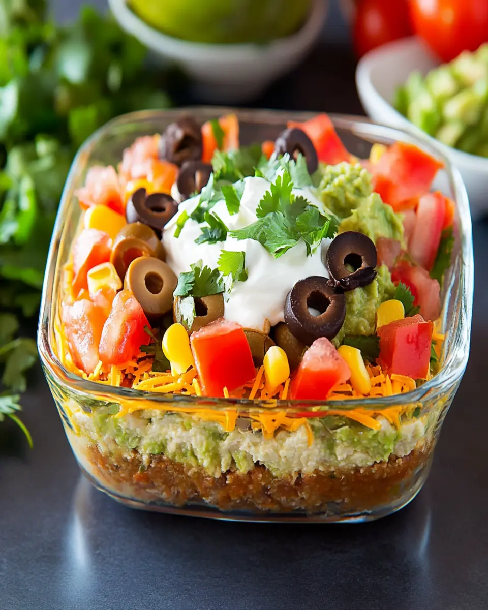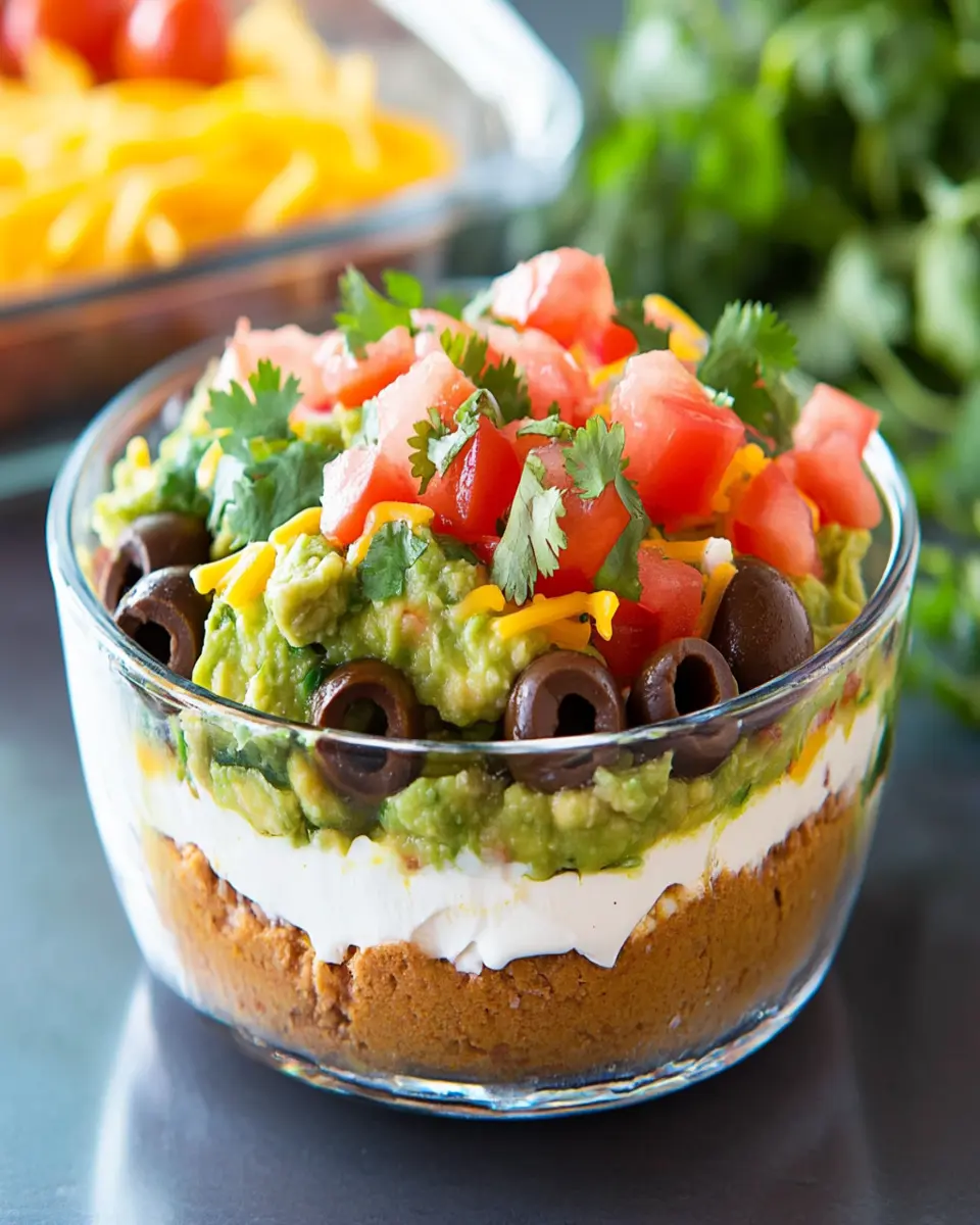 Consider prepping your ingredients ahead of time. You can chop green onions, slice olives, and even make your guacamole a few hours in advance. Just remember to store everything properly to maintain freshness. Layering the dip in a clear glass dish not only showcases the beautiful colors but also makes it easy for guests to dig in without disturbing the layers too much.