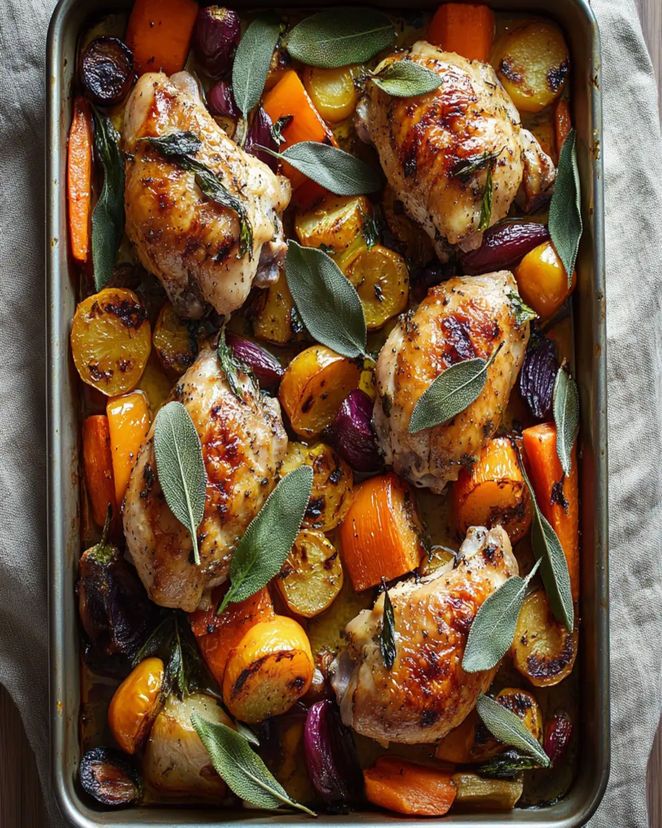 Imagine the aroma of tender chicken thighs and drumsticks roasting alongside baby potatoes, green beans, and zesty lemon wedges, all infused with the earthy notes of sage. This one-pan wonder not only delights the taste buds but also simplifies cleanup, allowing you to spend more time enjoying your meal and less time fussing over dishes.