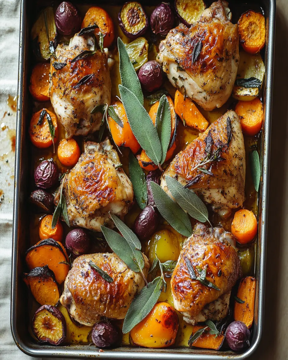 The Chicken & Sage Traybake is a simple, one-pan dish featuring chicken thighs and drumsticks seasoned with sage, roasted alongside baby potatoes and green beans. It’s a comforting meal that’s perfect for family gatherings or weeknight dinners.