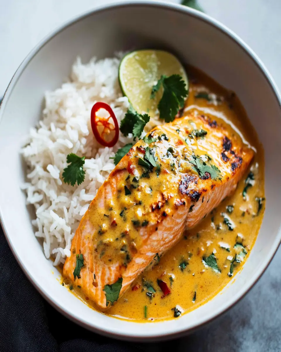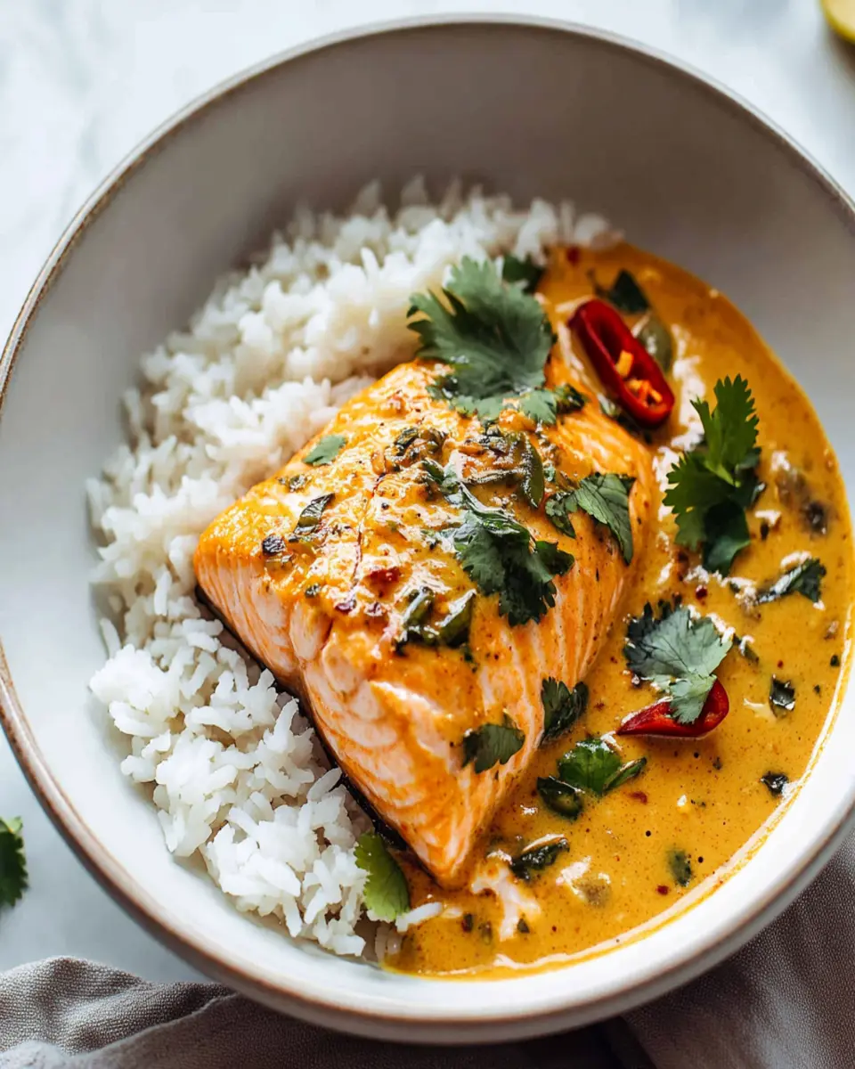 A delicious and creamy coconut salmon curry that is easy to prepare and full of flavor.