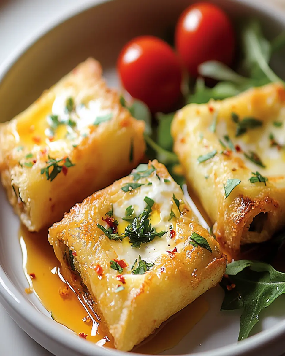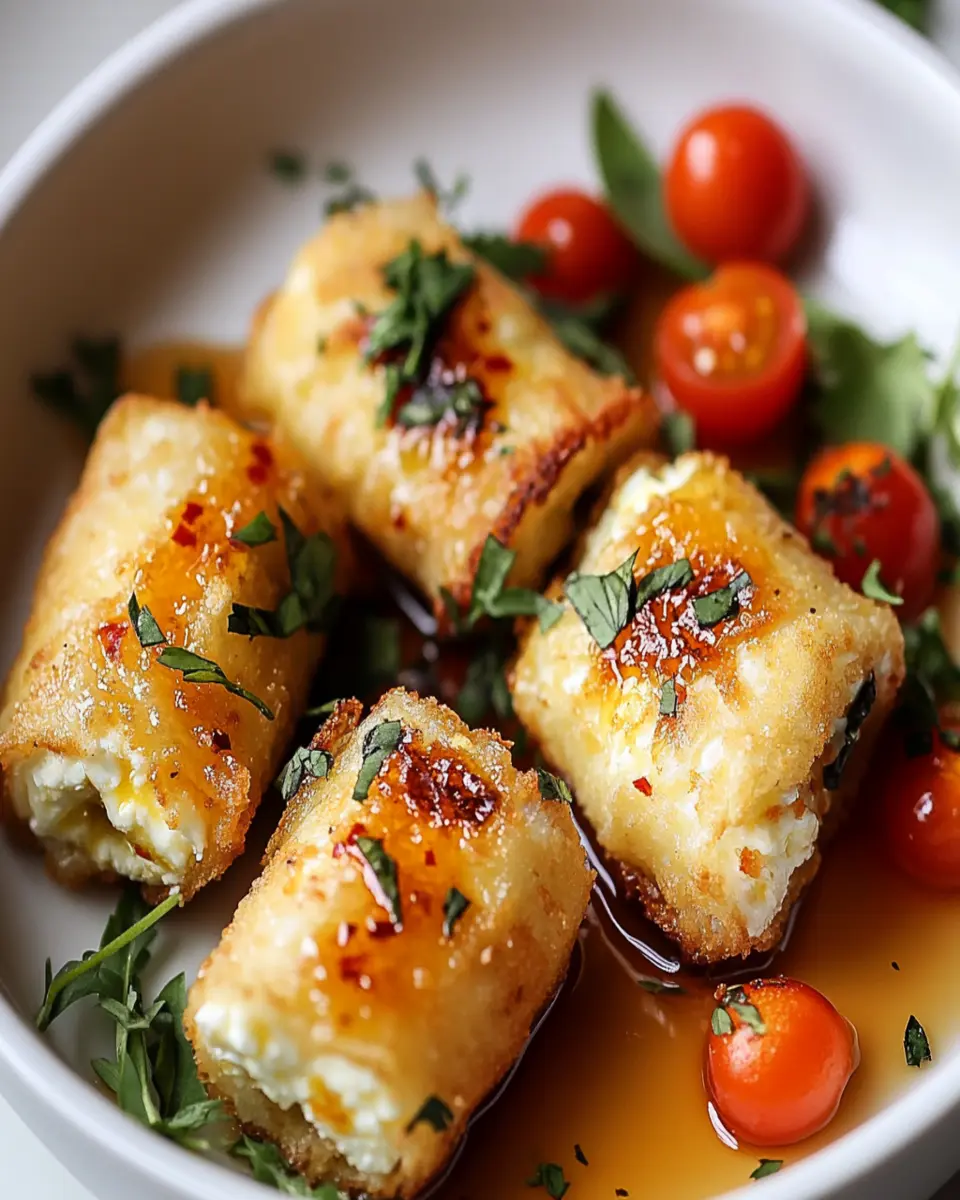 These Oven Fried Feta Rolls are a delicious blend of crispy pastry and creamy feta, drizzled with sweet chili honey for an irresistible appetizer.